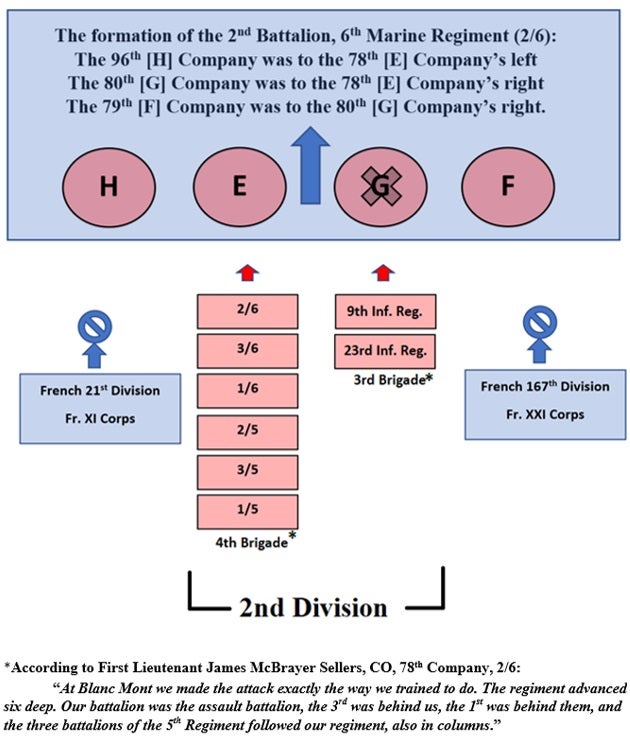 By 0500 hours (5:00 A.M.), all four companies of the 2nd Battalion, 6th Marine Regiment took position in conjunction to Operation Memo No. 9. The companies formed a line with the 81st Machine-Gun Company (carrying 12 French-made Hotchkiss M1914 Machine-Guns) in the far left, the 78th [E] Company in the left-center, 80th [G] Company in the right-center, and the 79th [F] Company as the far right element. The 2nd Battalion was located in the former German Krefeld Trench, located just north of the ruins of Somme Py, and its left flank was to be protect by the 96th [H] Company occupying the Boyou de Bromberg (communication trench).