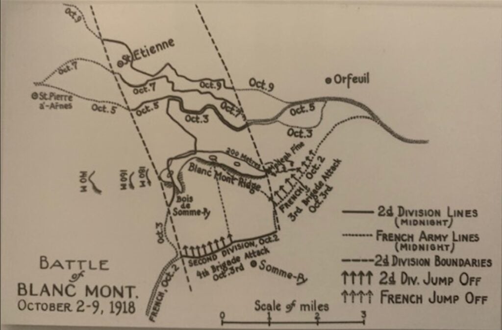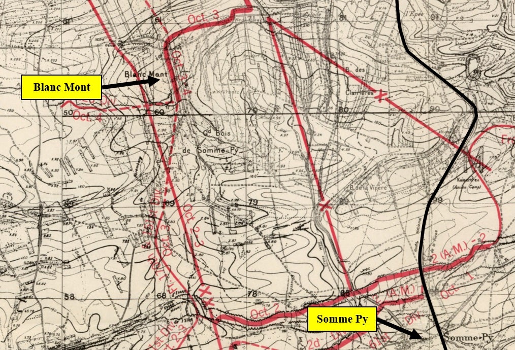 During the early morning of 1 October 1918, the American 2nd Division, of which the 4th Marine Brigade was attached, became an official element of the French XXI Corps, French Fourth Army. The 2nd Division was ordered to relieved the French 61st Division, French XXI Corps and a battalion of the French 21st Division, French XI Corps. The 2nd Division began its relief of the French element just north of Somme Py. At 2130 hours (9:30 P.M.), the French XXI Corps issued orders for the 2nd Division to attack Blanc Mont and detailed the 2nd Division to be the left element of the French XXI Corps assault line.