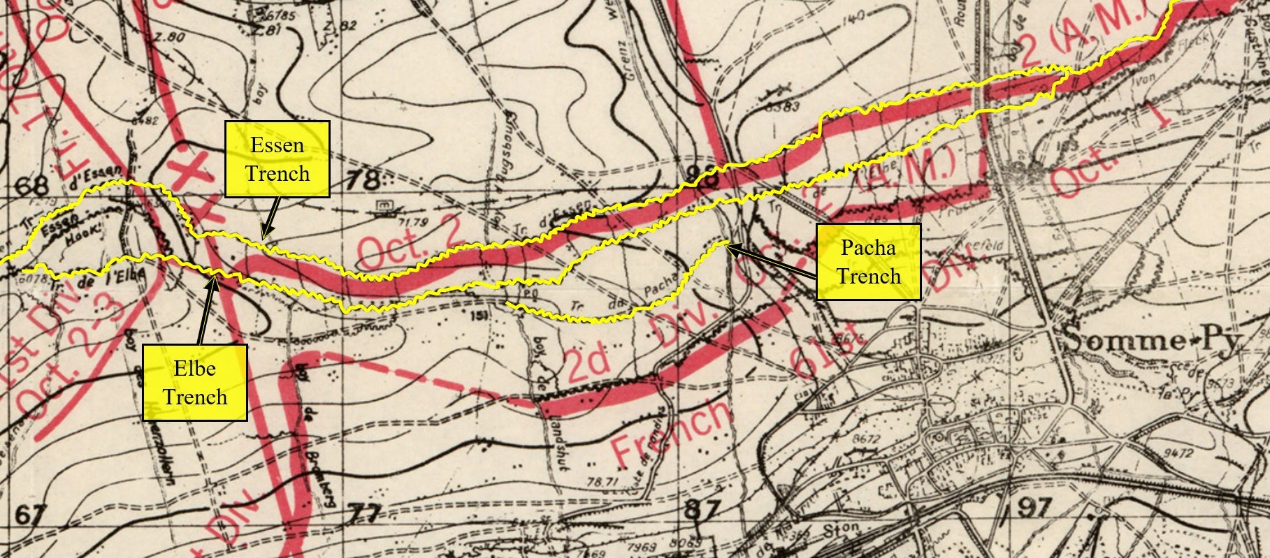 German trenchline night of 1 October/early morning of 2 October 1918. To the left of the map, between the Essen and Elbe Trenches, the “Essen Hook” can be seen. The “Essen Hook” referred to the bend in the Essen Trench that held a strongly fortified hill by the Germans that could command the ground between the 2nd Battalion of the 4th Marine Brigade and the two trench lines. The “Essen Hook” contained numerous and highly fortified machine-gun nests that the French were unable to break given its high position and view over the sector.