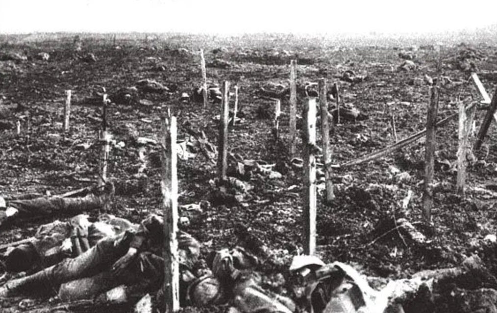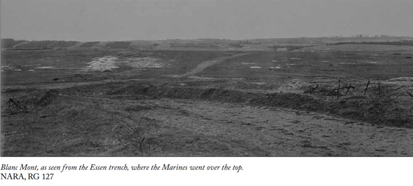 At 0800 hours (8:00 A.M.), the 2nd Division took command of their front, and the 4th Marines saw the horrors of the battle-scarred chalky white soil they would need to cross . The terrain was mostly flat with farrow fields overgrown with wild grass and destroyed towns in the distance, but pockets of long-slopping hills and ridges manifested between the open fields of fire that made picking of an attacker easy for the fortified German defenses. The ground was littered with dead soldiers, scattered material, and dead horses; the smell was unspeakable from the odor of the rotting corpses. In the distance, Blanc Mont ridge stood above a small pocket of forest, peering over the young trees like a giant eagerly awaiting its next victims.