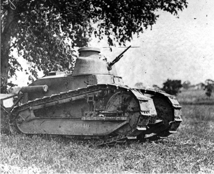 A female Renault FT-17 Light Tank. Male tanks would be equipped with a 37mm cannon. Female tanks were equipped with 8mm Hotchkiss machine-gun. The top speed of a Renault FT was 4.78 mph and was the first tank to use a rotating turret.
